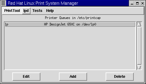 When the utility starts, you'll see a window similar to Figure 5-2. At first, you won't find any printers listed, because you haven't added a printer to /etc/printcap.