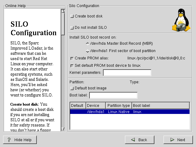 If the Create PROM alias: checkbox is checked, and if PROM supports it, the installer will create a PROM alias "linux." The "linux" PROM alias will allow you to boot into SILO from the PROM command line with boot linux. If the Set default PROM boot device to linux checkbox is checked, the installer will set the PROM option "boot-device" or "boot-from" so that PROM will boot by default into Red Hat Linux.