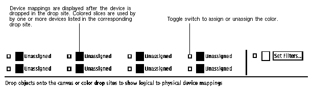 The canvas is also a destination for drag and drop. When devices are dropped on the canvas from the Metadevice Editor window, they take on the next available color. If all drop sites are in use, a window is displayed that enables you to select a drop site. Also, if any object is selected on the editor canvas and the Disk View window is invoked, the objects will automatically take on the color of the next available drop site.