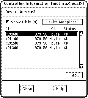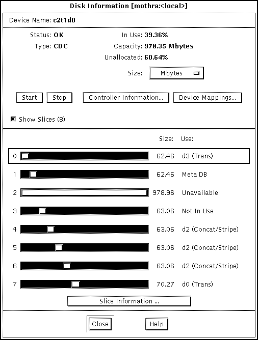 By pointing to a disk on the Disk View canvas and pressing the MENU button, a menu enables you to bring up an information window. Shown in Figure 4-9, the read-only Disk Information window provides information about a disk and its slices.