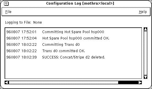 The Configuration Log window, as shown in Figure 4-25, provides a history of all top-level DiskSuite operations. Each item on the list is given a time stamp.