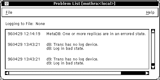 The Problem List window contains a scrolling list of the current metadevice problems. The list does not provide a history of the problems that have been encountered. The list is updated each time DiskSuite Tool learns of a change in status. Each item on the list is given a time stamp.