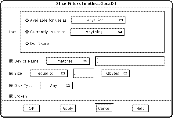 You can view slices that are available to be Metadevice Components, Hot Spares, Replicas, Trans Logs, or Anything. The default value is Metadevice Components. You can also view slices currently in use as a file system, swap, Metadevices, Hot Spares, Replicas, Trans Logs, or Anything. Clicking the Don't Care button tells DiskSuite Tool not to filter by usage. Regular expressions can also be used to filter slices in this window.