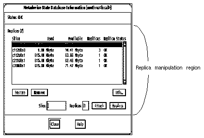 The Metadevice Editor window is the main window for DiskSuite Tool, enabling access to other parts of DiskSuite Tool. The following describes the areas within the Metadevice Editor window.