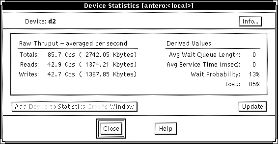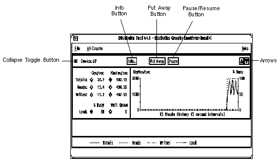 Figure 4-7 shows the Statistics Graph window (Grapher window). The Grapher window functions as a visual log of reported statistics utilizing a graph for each device. The Grapher window displays a subset of the information derived by the iostat(1M) interface. You can drag and drop metadevices and disks from any of DiskSuite Tool's windows to the Statistics Graphs window. This includes the Metadevice Editor canvas, the Metadevice Editor Objects list, the Slice window, and the Disk View window. An explanation of the Grapher window follows.