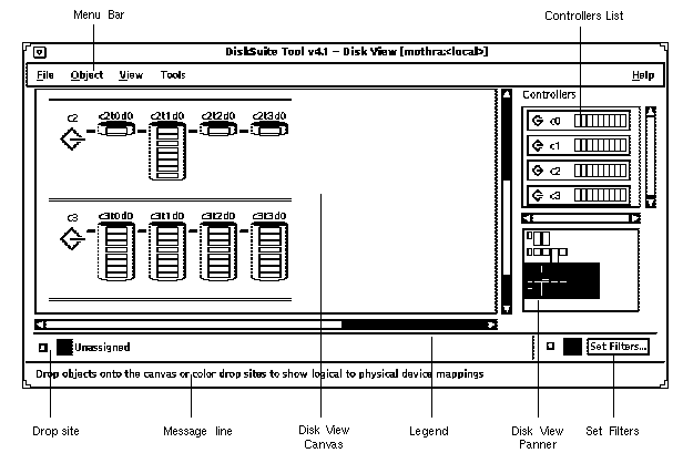 Figure 4-3, the Disk View window, shows how metadevices correspond to physical devices, and also serves as a drag-and-drop source for slices and a drag-and-drop target for metadevices. The following describes the areas within the Disk View window.