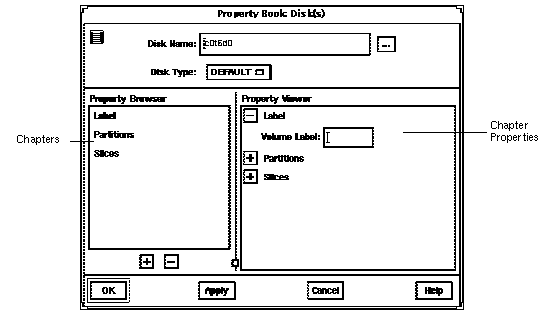 Storage Manager introduces the concept of a property book. A property book is the mechanism by which you identify, view, and modify the properties of editable objects, such as disks or file systems. A property book, using a book metaphor, contains a list of chapters that represent properties for the object. You can expand each chapter to view or modify the properties.