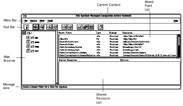Figure A-2 shows the important areas of the File System Manager's main window.