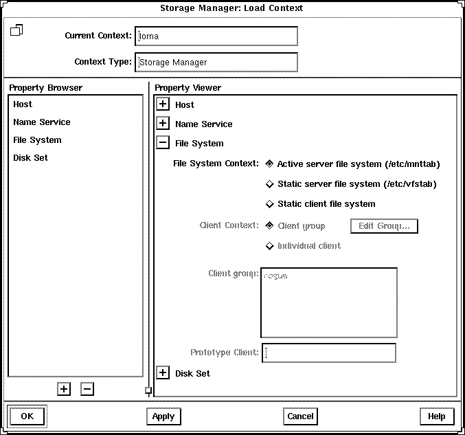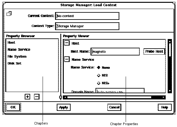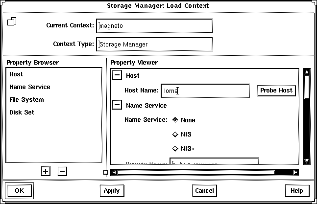 The purpose of the Load Context Property Book is for you to set the context in which Storage Manager will operate. Generally, a context is the way to manage the properties of an object. In the case of File System Manager, the context includes which host to manage, what name service to modify or how to view and modify the file systems on a server. In the case of Disk Manager, the context includes what diskset (a logical grouping of disks) to modify if you have DiskSuite software installed.