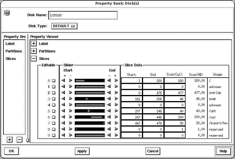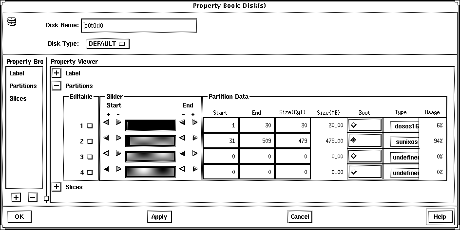 Disk Manager is a tool that enables you to view and edit fdisk partitions and slices using two types of windows, the main window and a Property Book. The main window displays the controllers, targets, disks, and slices for the current context. The Property Book displays the chapters and their properties for the selected disk(s), and it is at this level that you can view and edit disk properties.