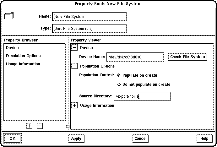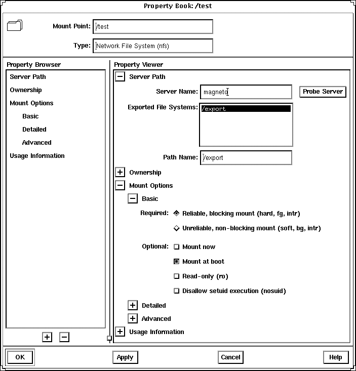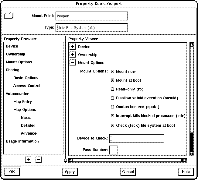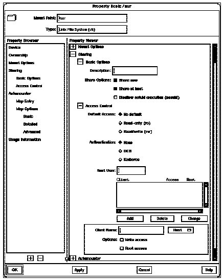 Note - Once you select a mount point or directory, the Object menu may allow you to automatically mount a file system, unmount a file system, share a directory, or unshare a directory. If you want to complete one of these tasks, it is faster to use the Object menu rather than make the change using the Property Book.