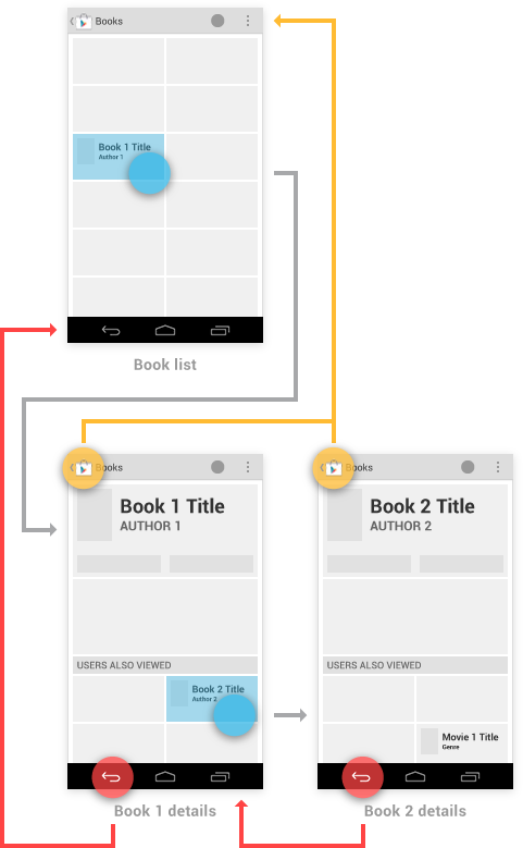 For information about how to build your app with proper Up and Back navigation, read Implementing Ancestral Navigation and Implementing Temporal Navigation, respectively.