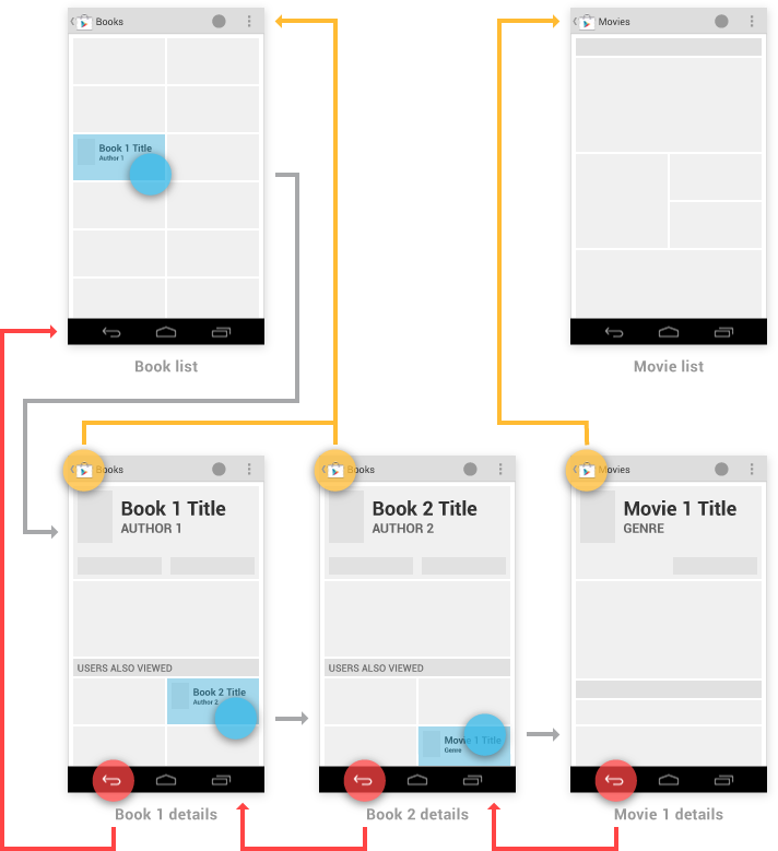 You have the ability to make the Up behavior even smarter based on your knowledge of detail view. Extending the Play Store example from above, imagine the user has navigated from the last Book viewed to the details for the Movie adaptation. In that case, Up can return to a container (Movies) which the user hasn't previously navigated through.