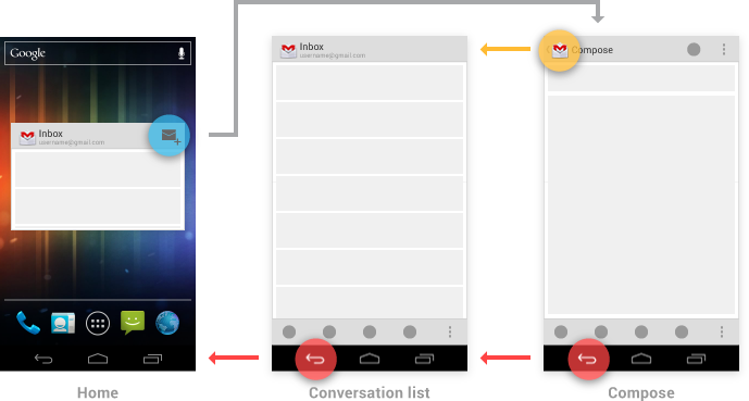 However, by touching Up from the compose activity, the user indicates a desire to remain within Gmail. Gmail's conversation list activity appears, and a new Task B is created for it. New tasks are always rooted to Home, so touching Back from the conversation list returns there.