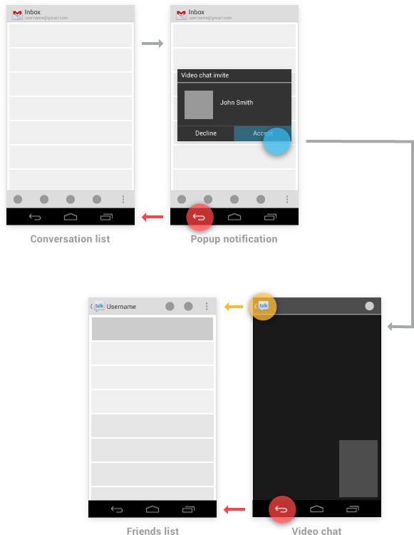 In terms of navigation behavior, pop-up notifications closely follow the behavior of an indirect notification's interstitial screen. Back dismisses the pop-up notification. If the user navigates from the pop-up into the notifying app, Up and Back follow the rules for standard notifications, navigating within the app.