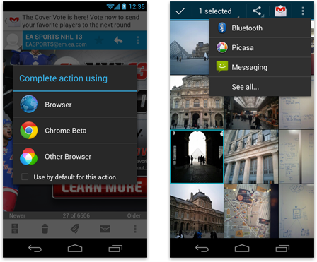 In some cases you might want your app to take advantage of another app's feature set. For example, you may want to share the content that your app created via a social network or messaging app, or view the content of a weblink in a browser. Don't use hard-coded, explicit links to particular apps to achieve this. Instead, use Android's intent API to launch an activity chooser which lists all applications that are set up to handle the particular request. This lets the user complete the task with their preferred app. For sharing in particular, consider using the Share Action Provider in your action bar to provide faster access to the user's most recently used sharing target.