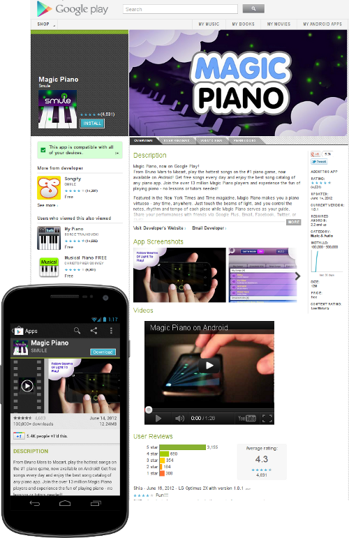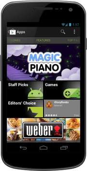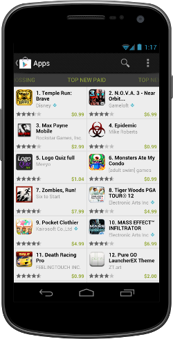 Google Play is a central part of the Android experience. New users personalize their devices with apps, games, and other Google Play content. Existing users return regularly to see what's trending and new. Downloading new apps is extremely convenient and fast— Google Play pushes apps to the user's devices instantly, over the air. No cable or sync is ever needed.