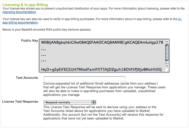 Figure 2. The Licensing and In-app Billing panel of your account's Edit Profile page lets you see your public key.