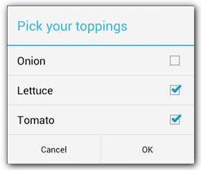 - A dialog that can show a title, up to three buttons, a list of selectable items, or a custom layout.