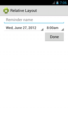 <?xml version="1.0" encoding="utf-8"?> <RelativeLayout xmlns:android="http://schemas.android.com/apk/res/android" android:layout_width="fill_parent" android:layout_height="fill_parent" android:paddingLeft="16dp" android:paddingRight="16dp" > <EditText android:id="@+id/name" android:layout_width="fill_parent" android:layout_height="wrap_content" android:hint="@string/reminder" /> <Spinner android:id="@+id/dates" android:layout_width="0dp" android:layout_height="wrap_content" android:layout_below="@id/name" android:layout_alignParentLeft="true" android:layout_toLeftOf="@+id/times" /> <Spinner android:id="@id/times" android:layout_width="96dp" android:layout_height="wrap_content" android:layout_below="@id/name" android:layout_alignParentRight="true" /> <Button android:layout_width="96dp" android:layout_height="wrap_content" android:layout_below="@id/times" android:layout_alignParentRight="true" android:text="@string/done" /> </RelativeLayout>