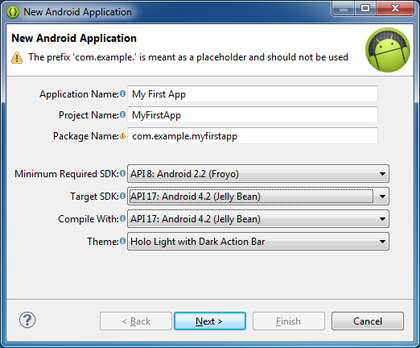 - Compile With is the platform version against which you will compile your app. By default, this is set to the latest version of Android available in your SDK. (It should be Android 4.1 or greater; if you don't have such a version available, you must install one using the SDK Manager). You can still build your app to support older versions, but setting the build target to the latest version allows you to enable new features and optimize your app for a great user experience on the latest devices.