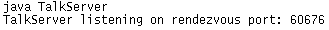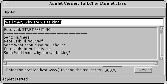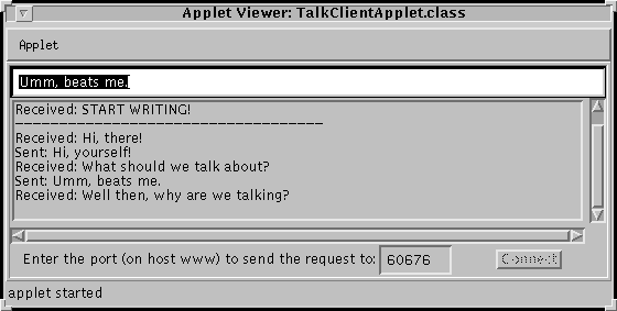 TalkServerclass.The instructions for running the server are just like those for the previous example. Run the server on the applets' originating host, recording the port number the applets should rendezvous on. then initialize both applets (which can be running on different machines) to talk to the server port number. After this initialization is complete, type into each applet and press the Return key to send the message to the other applet.
