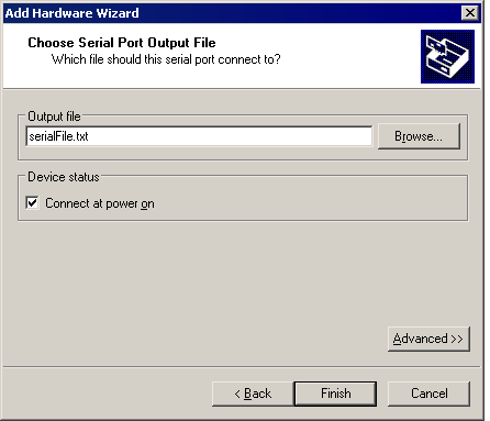 5. Browse to the file on the host computer that you want to use to store the output of the virtual serial port. By default, the device status setting is Connect at power on. You may deselect this setting if you wish.