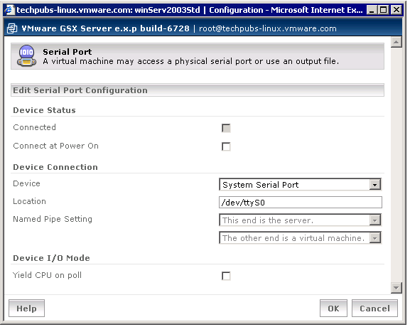 Note: If you are connecting with a Windows console to add a physical serial port to a virtual machine on a remote Linux host, be sure to specify a Linux device name here, such as /dev/ttyS0. If you are connecting with a Linux console to add a physical serial port to a virtual machine on a remote Windows host, be sure to specify a Windows device name here, such as COM1.
