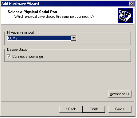 5. Choose the port on the host computer that you want to use for this serial connection. By default, the device status setting is Connect at power on. You may deselect this setting if you wish.