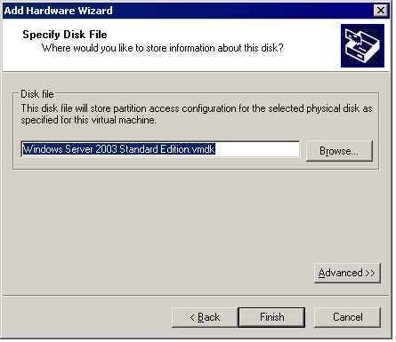 Click Advanced if you want to specify the virtual machine SCSI or IDE device node to which this disk is connected.