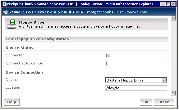 3. To connect this virtual machine to the floppy drive when the virtual machine is powered on, check Connect at Power On.