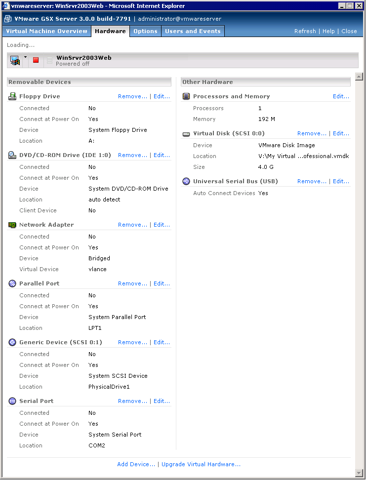 The Hardware page lists the virtual hardware in the virtual machine configured devices like the virtual disk; removable devices like floppy, CD-ROM or DVD-ROM drives; virtual network adapters and memory allocated to the virtual machine.