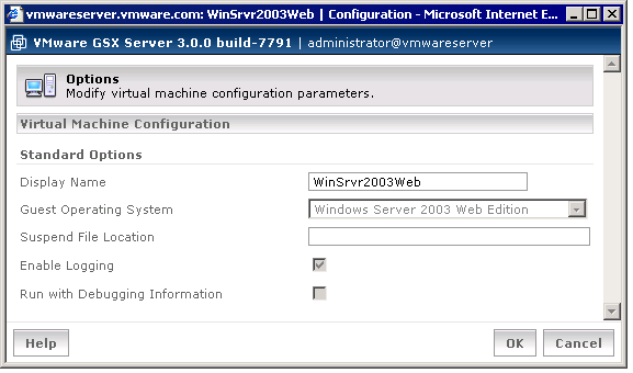 To review and modify basic information about a virtual machine, or to access the configuration file directly, click the Options tab. The Options page appears.