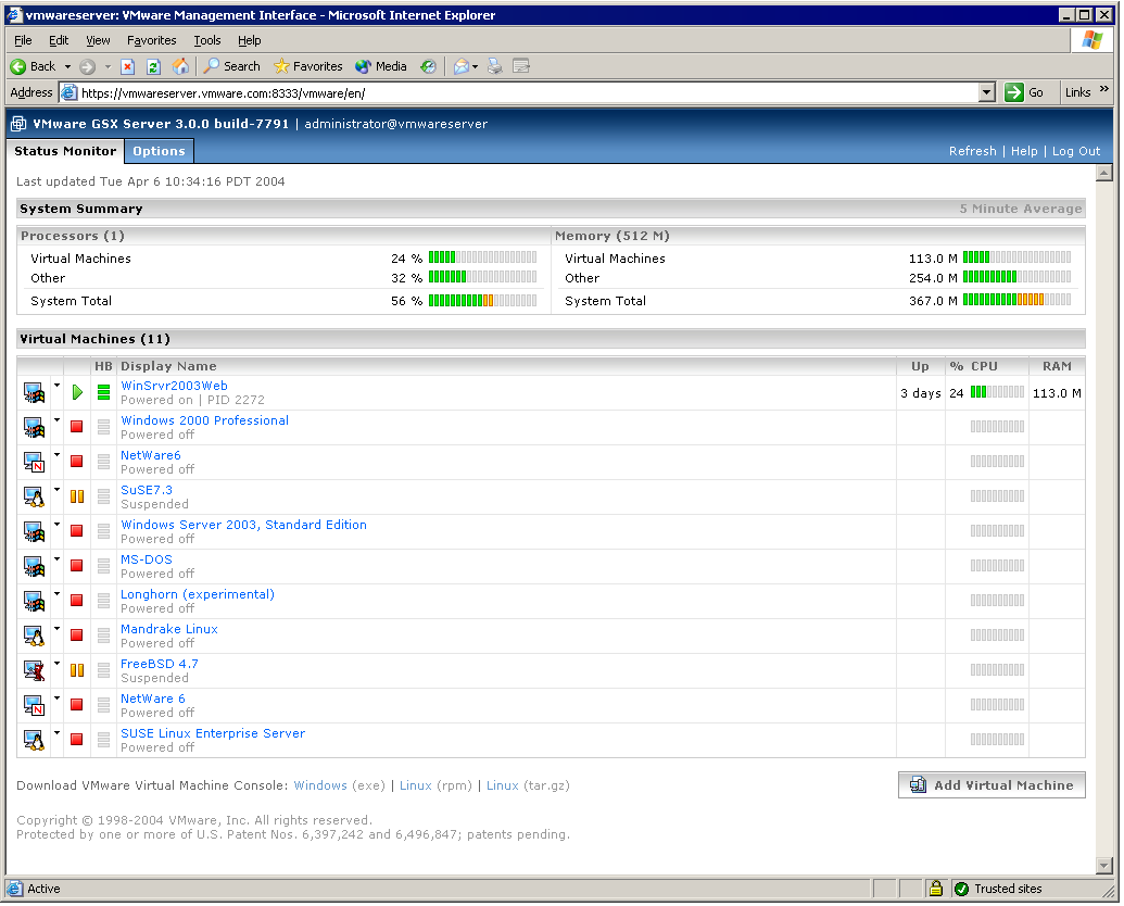 The Status Monitor page contains a high-level view of the GSX Server host including a host system summary and list of all virtual machines known to the host that you have sufficient permissions to see.