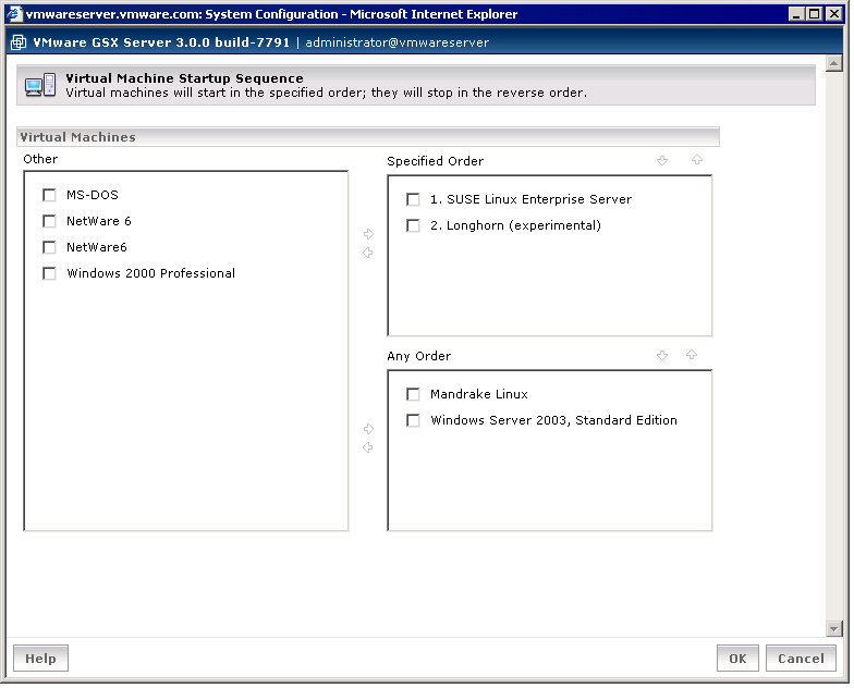 Specified Order lists the virtual machines in the order in which they are configured to start. The order in which the virtual machines stop is the reverse of the order in which they start, so the last virtual machine to start when the system starts up is the first to stop when the system shuts down. To specify the startup order, select machines and use the arrows to move them up or down within the list.