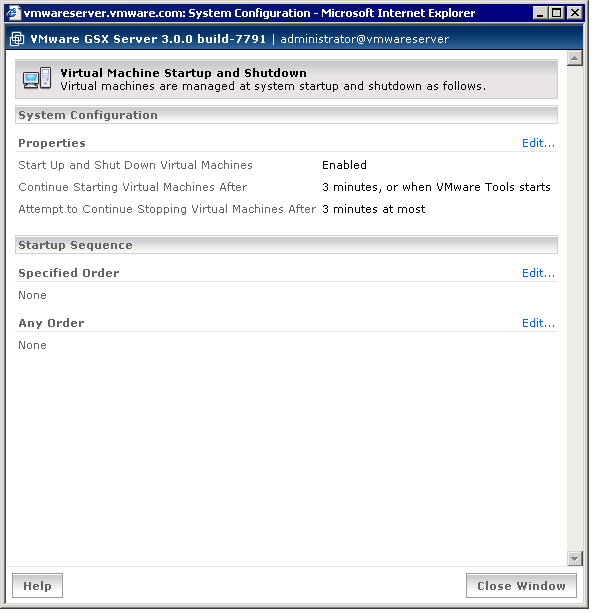 1. On the Virtual Machine Startup and Shutdown page, under System Configuration, click Edit. The System Startup and Shutdown Defaults page appears.