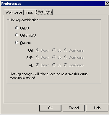 Use the Hot Key tab to change which combination of keys (the Ctrl, Alt and Shift keys in combination with other keys) are passed to the guest operating system or are intercepted by GSX Server.