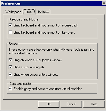 Note: The Grab when cursor enters window option allows you to move the mouse pointer back into the virtual machine window easily if you have been working in the virtual machine and temporarily moved the mouse pointer outside the virtual machine window. The mouse pointer is grabbed only when GSX Server has focus (is the active application). If you release the mouse pointer by pressing a hot-key combination the default is Ctrl-Alt you must click inside the virtual machine window to make GSX Server grab the mouse pointer again.