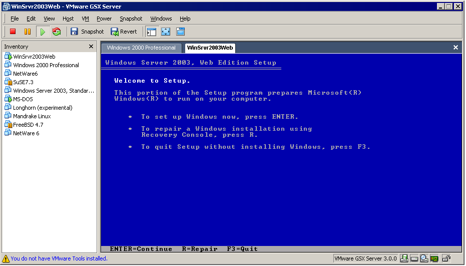 2. Power on the virtual machine to start installing Windows Server 2003.