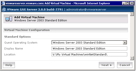 5. After you finish configuring the virtual disk, click Next. GSX Server creates the virtual machine and preallocates all the virtual disk space. The new virtual machine appears on the Status Monitor page.