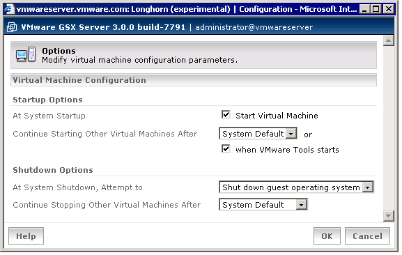 Configuring Startup and Shutdown Options for Virtual Machines. You must log in to the management interface as an administrator to configure the GSX Server host.