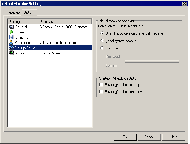 In order for you to specify these options, the virtual machine must be configured to run as either the local system account or as a specific user. The virtual machine cannot be configured to run as the user that powers it on.