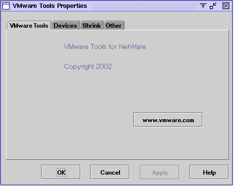 This section shows the options available in a NetWare 6.5, 6.0 or 5.1 guest. Since there is no graphical user interface for NetWare 4.2, there is no VMware Tools control panel as there is for newer NetWare guests. You can configure certain virtual machine options such as time synchronization, CPU idling and device configuration with VMware Tools in a NetWare 4.2 guest in the system console. For more information, see