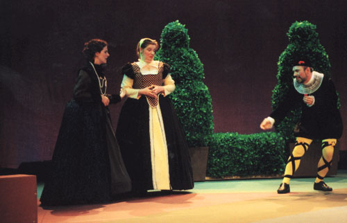 Toby, Andrew, and Fabian hide in the garden to listen in on Malvolio |