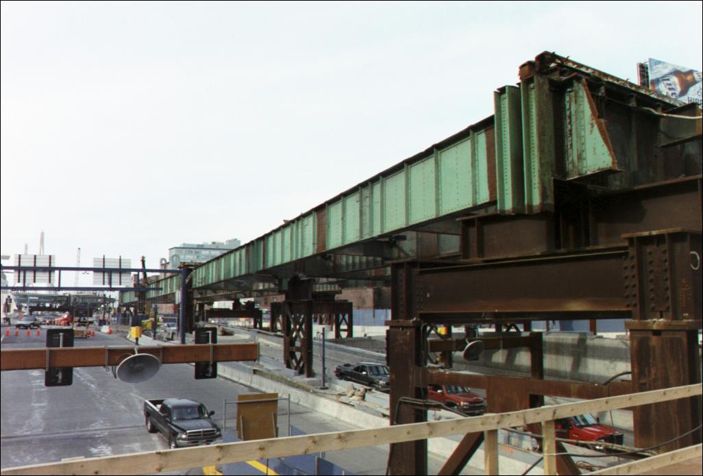 What remains of the Central Artery is being demolished sporadically. This block-long section of one side of the highway has no surface.