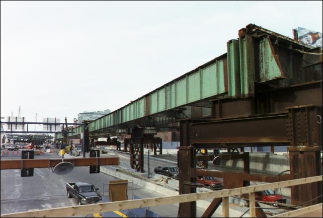 What remains of the Central Artery is being demolished sporadically. This block-long section of one side of the highway has no surface.