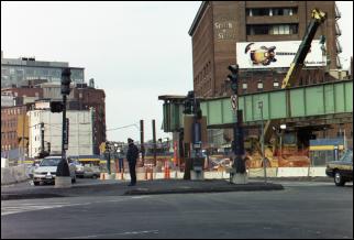 The elevated highway ends abruptly at Haymarket Square. Looking to the north, down North Washington Street.