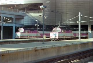 MBTA F40PH-2C locomotives 1066 and 1063 prepare to lead their trains southwards.