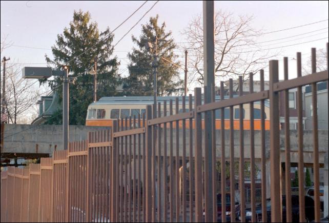 A departing PCC climbs up on a bridge to cross over the Red Line tracks leaving Ashmont.