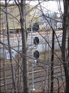 Description : Another signal. Note the small signal head below and to the left of the bottom head of the main signal; I can't tell what it's for, and there's a separate dwarf signal protecting the freight track here.